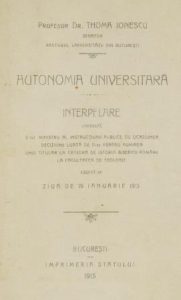 R. Broșură despre „Autonomia universitară” redactată de profesorul Thoma Ionescu (1915).