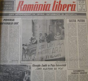 The Newspaper ”România liberă” presenting an article about University Square during the 1990 demonstrations